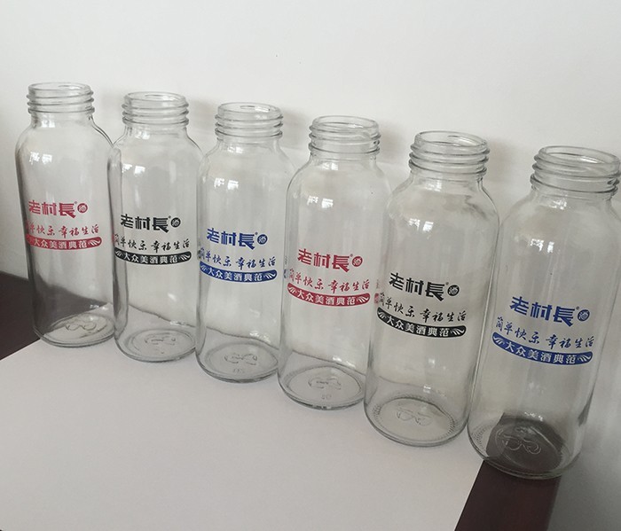 蒙砂酒瓶是在制品玻璃上,粘附一定大小面積的玻璃色釉粉,玻璃瓶廠經(jīng)過580~600℃的高溫烘烤,使玻璃色釉涂層凝結在玻璃外表,并顯現(xiàn)出具有與玻璃主體不同顏色的一種裝飾辦法。粘附玻璃色釉粉,可用排筆涂刷,亦可用膠輥滾涂。經(jīng)過絲印加工,能夠得到蒙砂面的樓空圖案。 其辦法是:在玻璃制品外表上,絲印一層由阻熔劑構成的圖案紋樣。